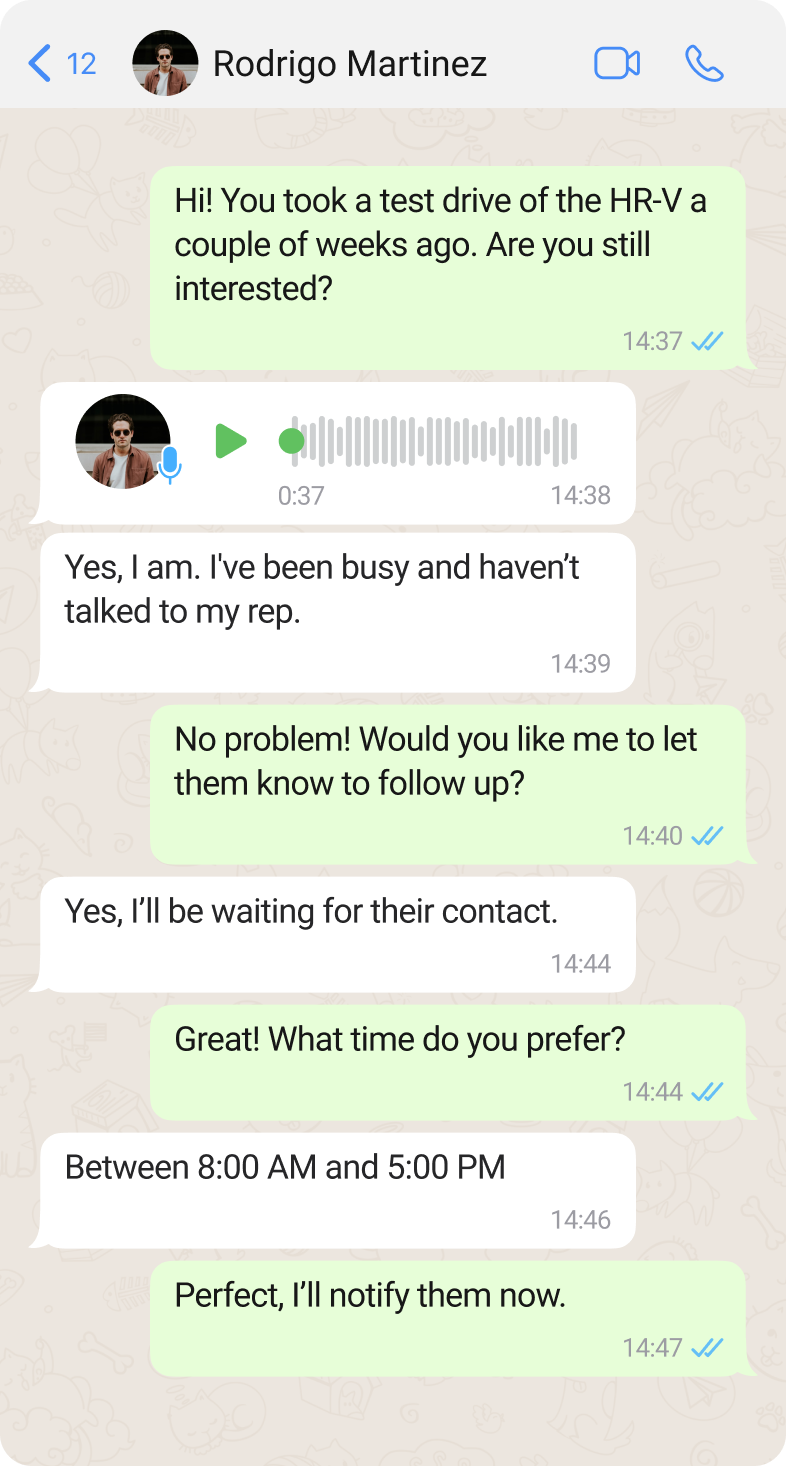 Your virtual assistant schedules test drives, answers on models and prices, and keeps customers interested. More engagement, less waiting, and a direct sales channel.