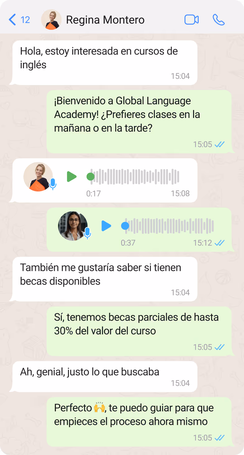 Responde en tiempo real a preguntas sobre matrículas, programas y horarios, liberando tiempo administrativo para mejorar la experiencia de tus alumnos.