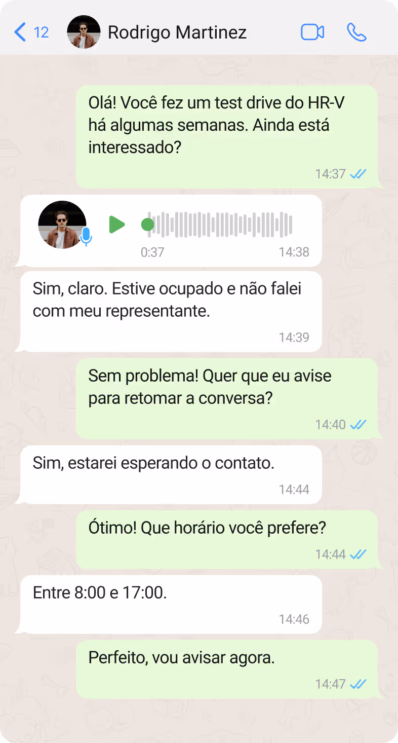 Seu assistente virtual programa test drives, responde sobre modelos e preços e mantém os clientes interessados. Mais engajamento, menos espera e um canal de vendas diretas.