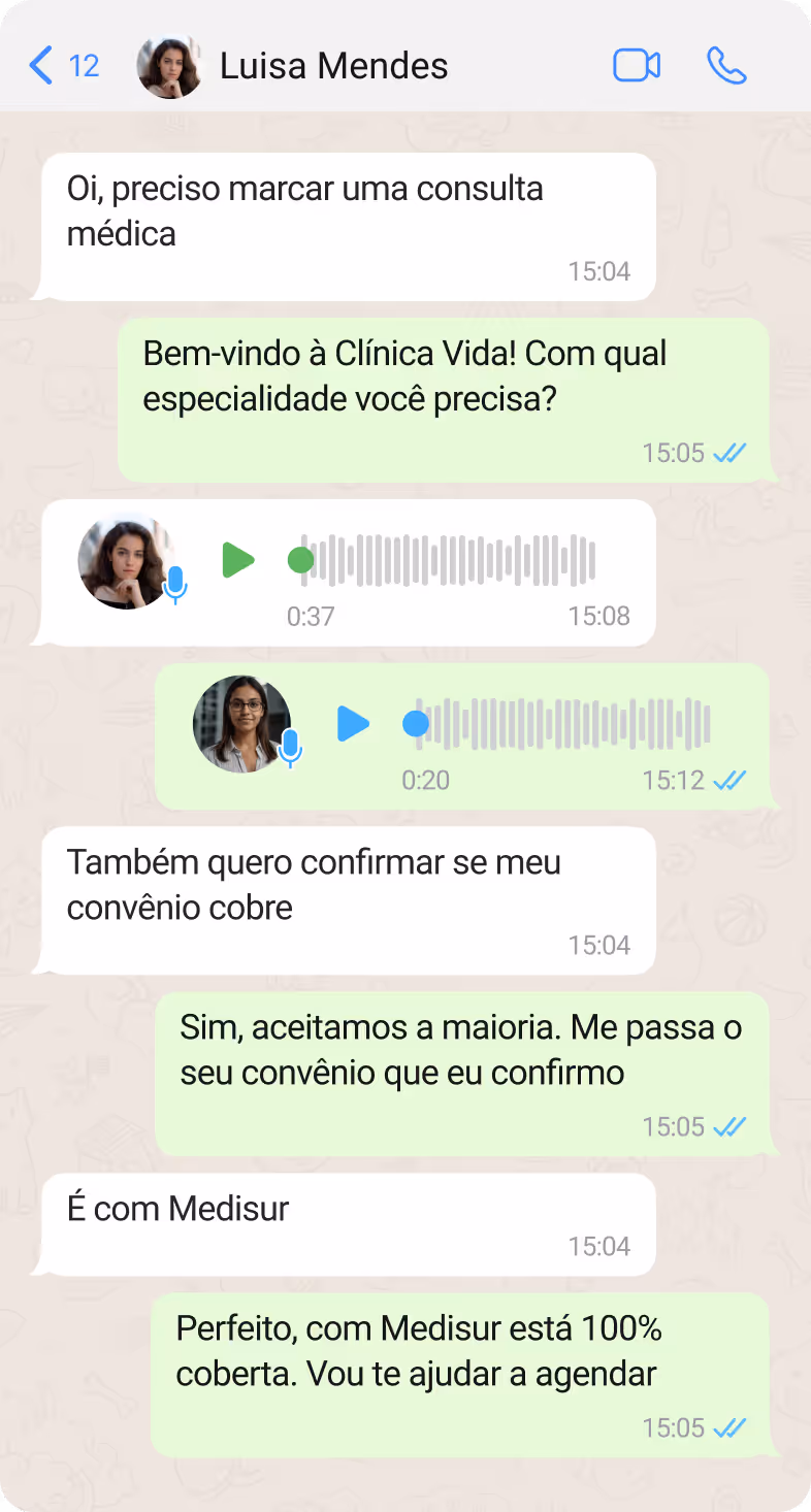 Seu chatbot agenda consultas médicas em segundos, confirma a cobertura do seguro e responde às perguntas mais frequentes dos pacientes. Atendimento mais ágil e disponível 24 horas por dia, 7 dias por semana para sua clínica.